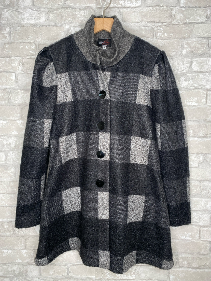 Cute buffalo check grey/black fit and flare coat with pockets. Approx MSMTS Flat Underarm to Underarm 18.5" Collar to Hem 33" Excellent condition.