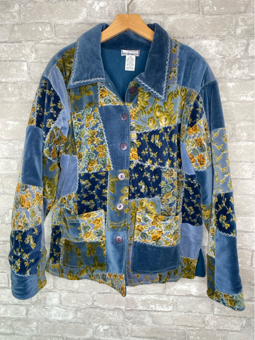 This velvety poly-filled VINTAGE puffer will surely keep you feeling warm and stylish! The floral patchwork design features light blue embroidered stitching and dark purple buttons for closure. Approx. MSMNTS: pit-pit: 23" shoulder-hem: 26" sleeves: 24"
