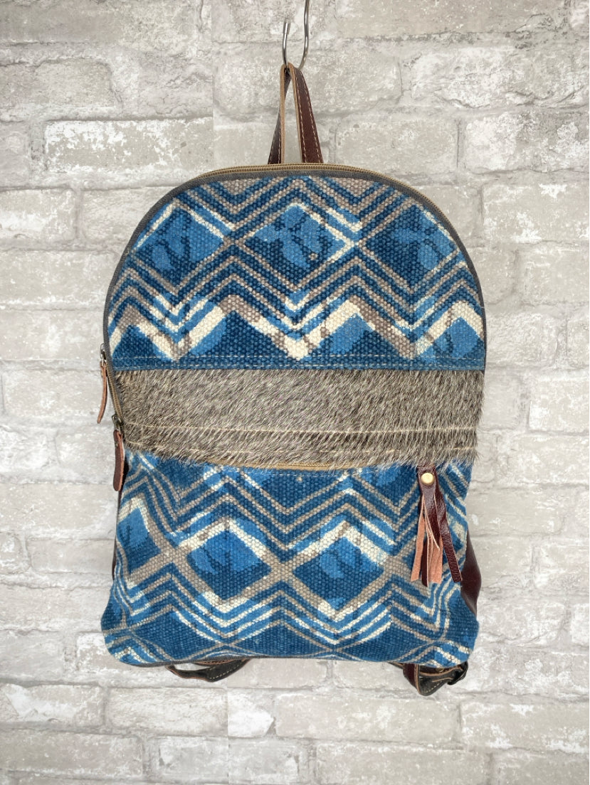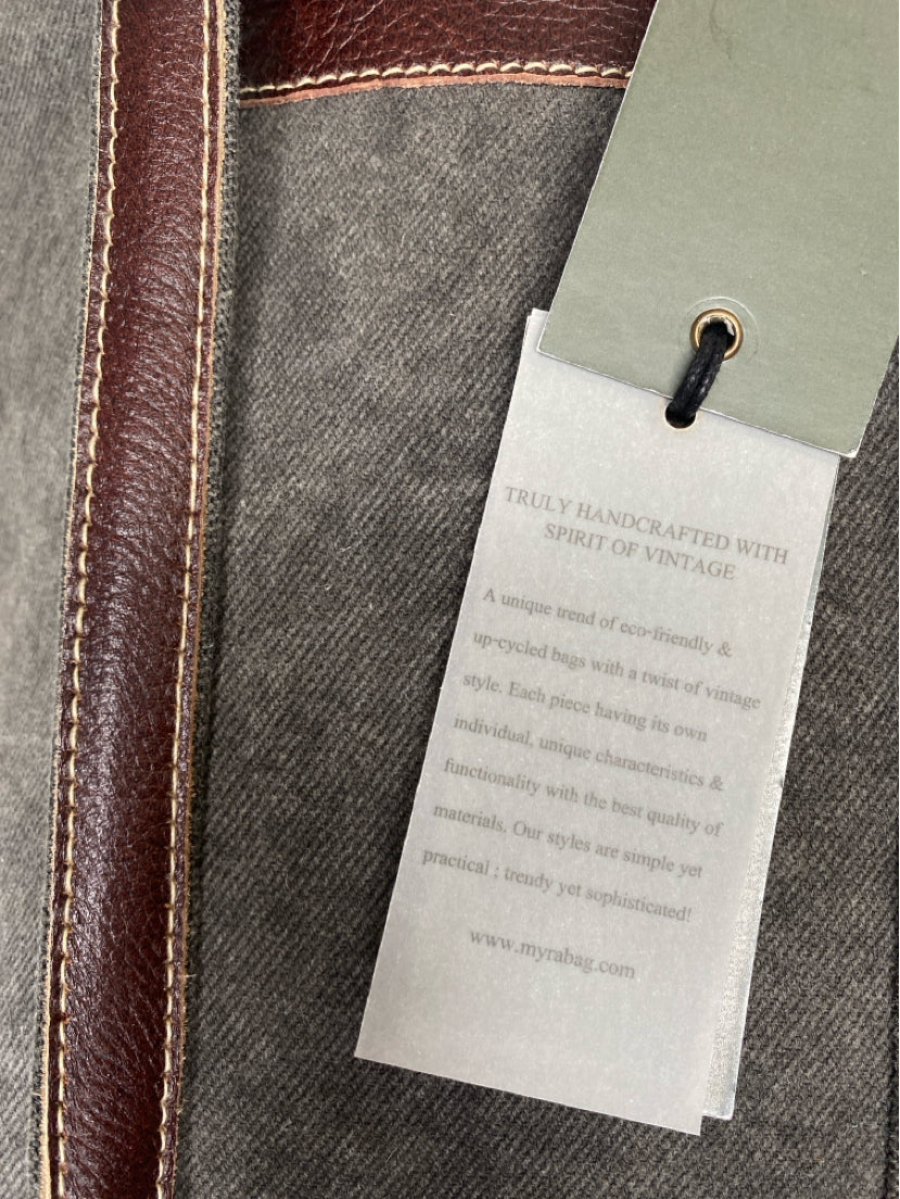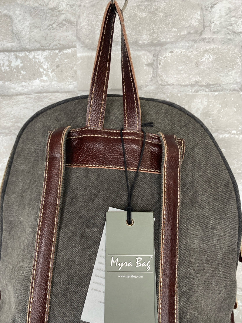 NEW Myra Blue breeze backpack. Stylish as well as functional. Natural vegatable tanning processes and handcrafted from recycled military tents. Dimensions 12.5" (W) x 14.5" (H) x 4" (D)