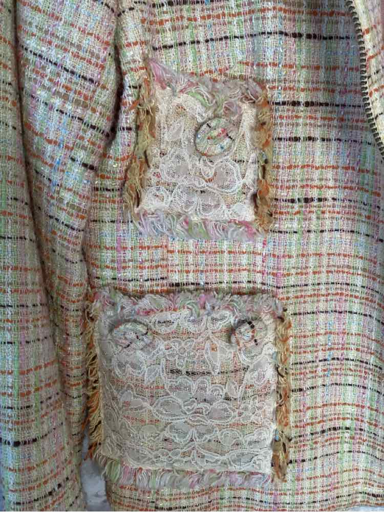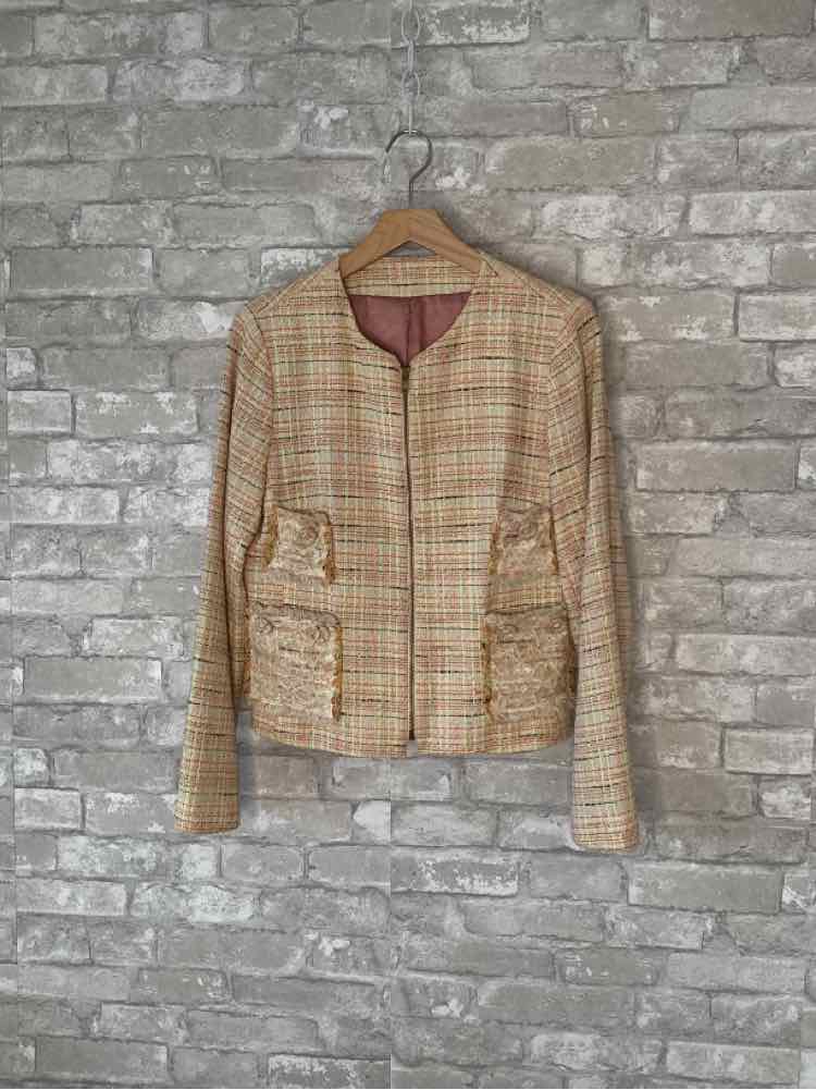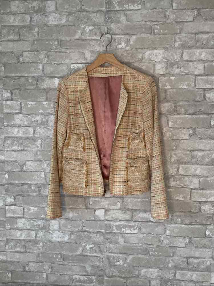 Full zip jacket blazer with lace details and a unique texture crafted from a broad variety of materials. Lined with silky soft pink acetate.