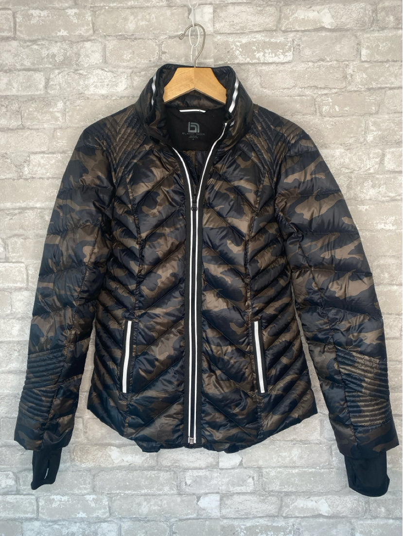 80% down filled. Hood zipped into collar. Tight cuffs with thumb holes to prevent drafts. Inside phone pocket. Reflective trim. Runs small - see measurements for fit. Pit to pit: 18.5" Shldr to hem: 25" Flat waist measurement: 17.5"