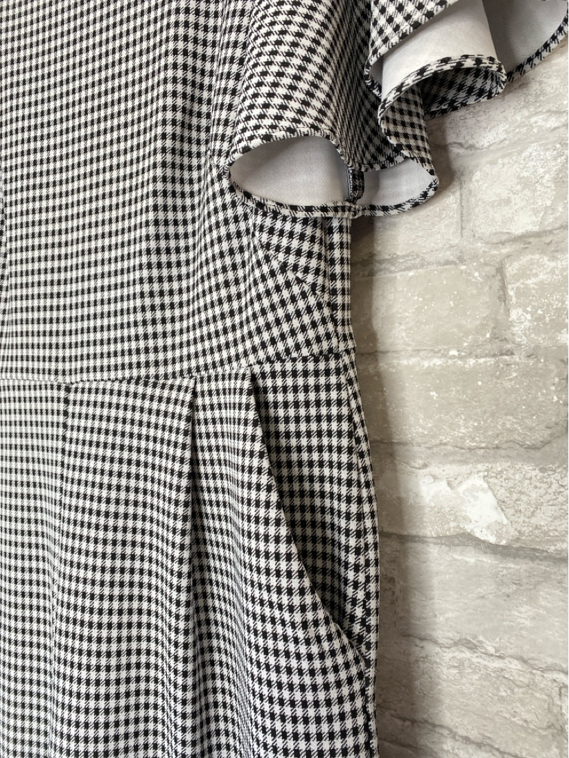 Adorable gigham/houndstooth wide leg jumpsuit with a pleated waist, flutter sleeves, and pockets! Approx. MSMNTS: pit-pit: 18.5", flat waist: 16.5" inseam: 32", outseam: 45"