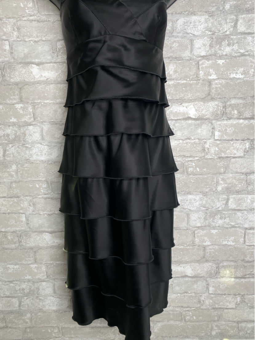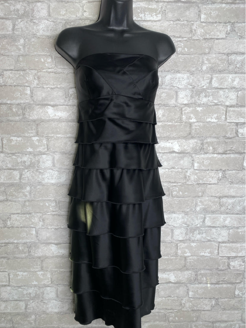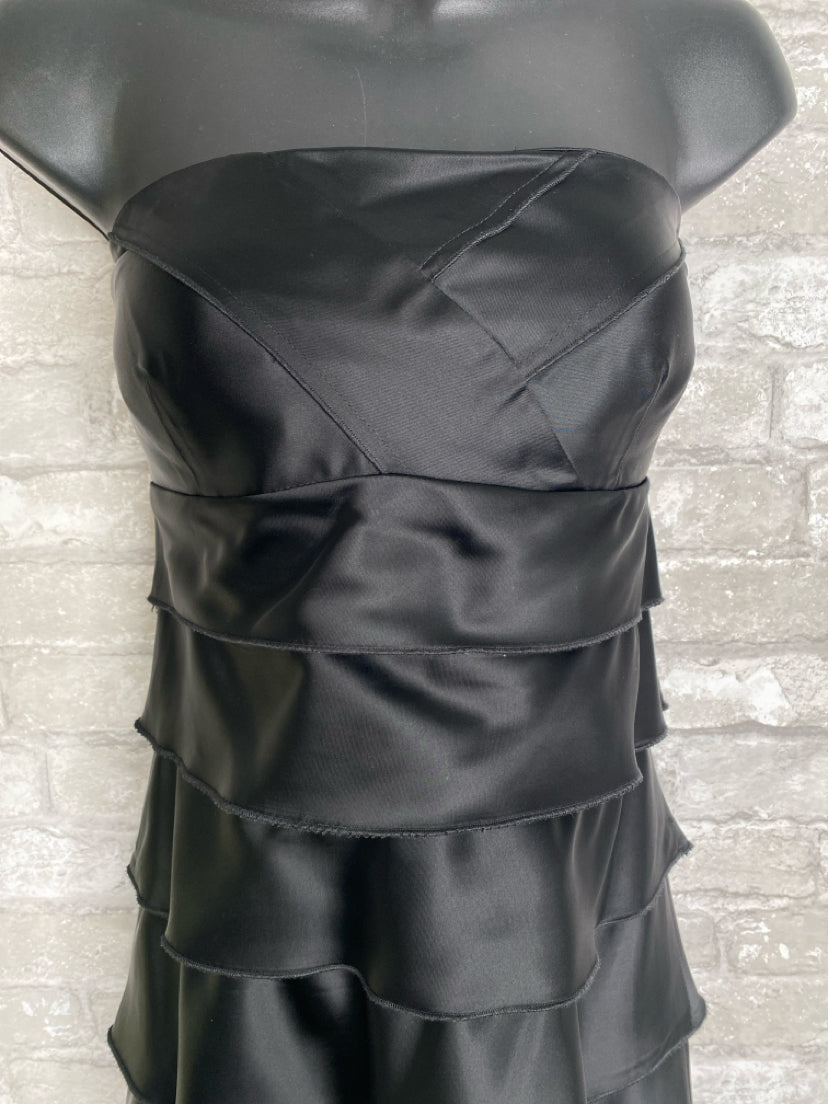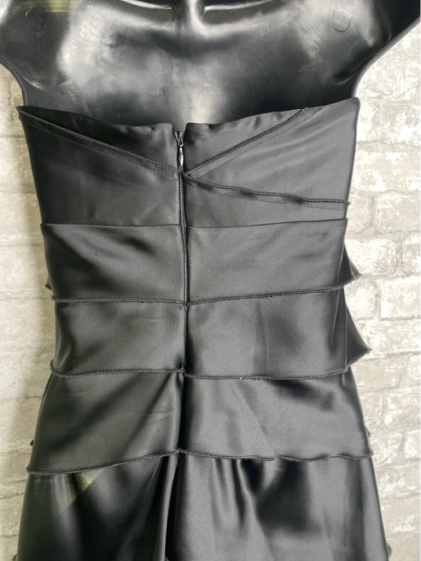 Elegant strapless layered satin little black dress. Full back zipper. Approx. flat measurements bust 17" length 32"