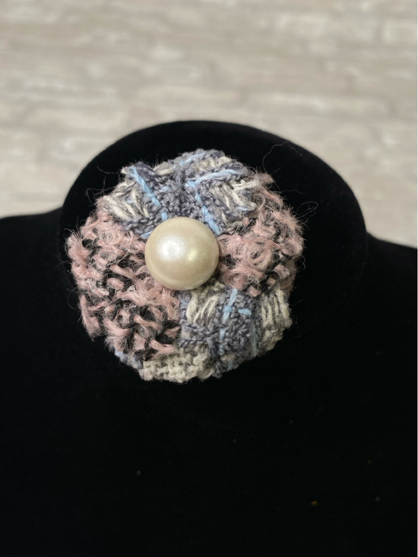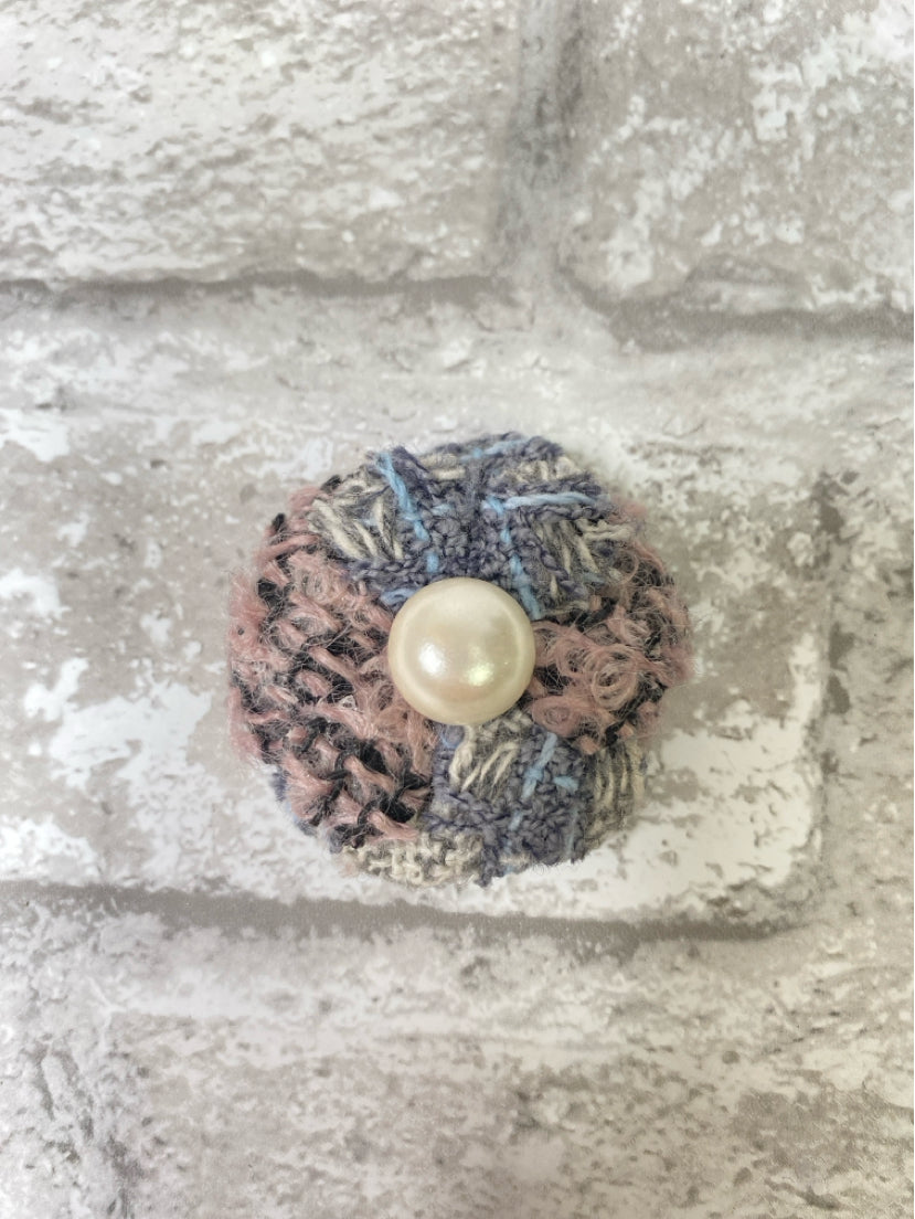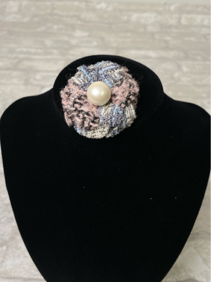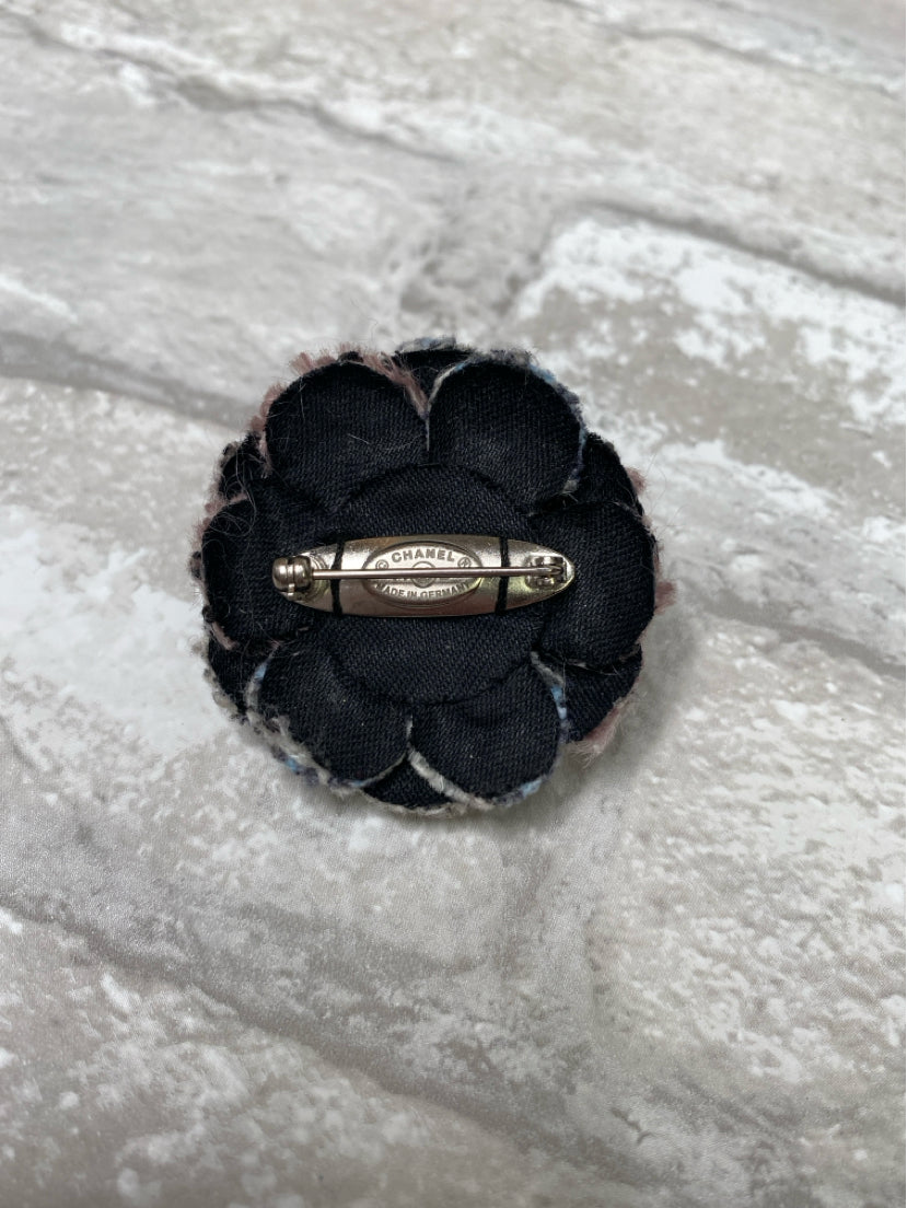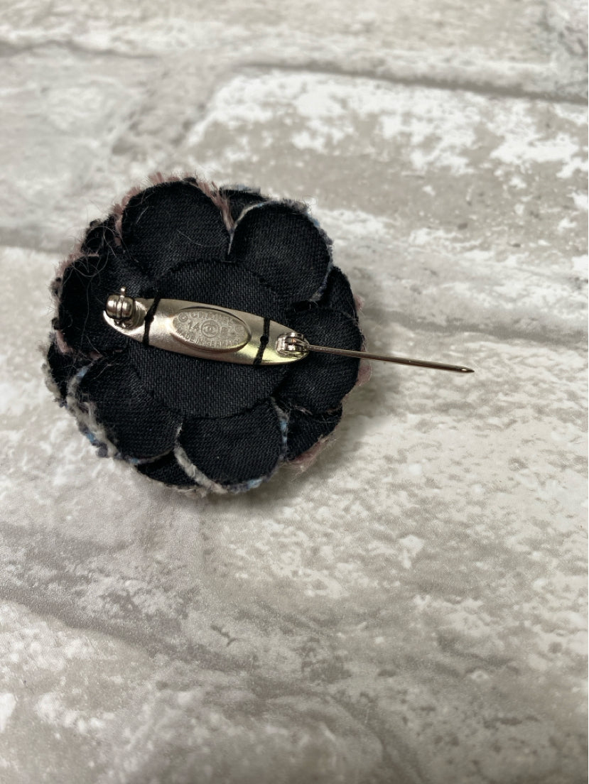 AUTHENTIC little Chanel flower brooch in a lovely loose knit tweed with a faux pearl center. Approximately 4.5 cm in length. In good pre-owned condition.