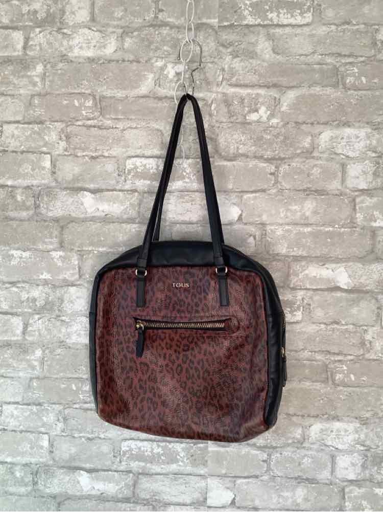 Leather animal print exterior, canvas interior with gold hardware. 12" x 12"