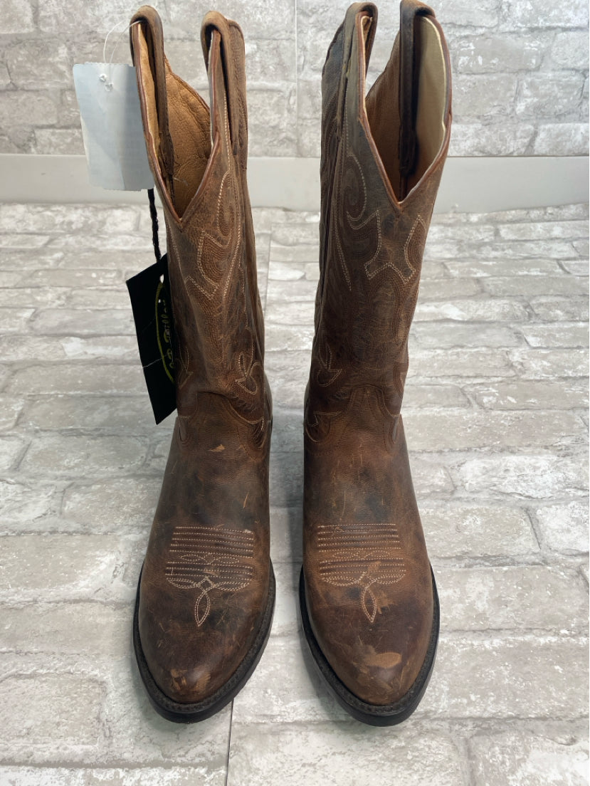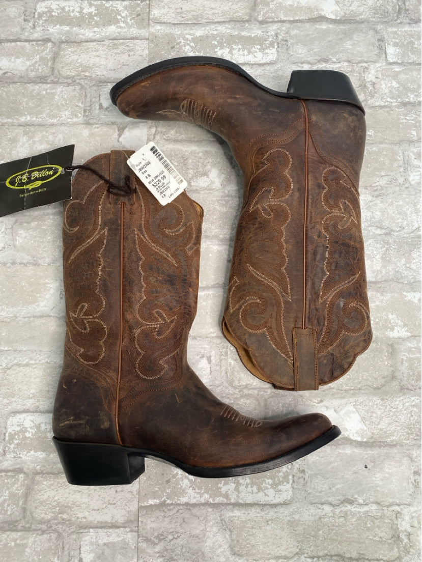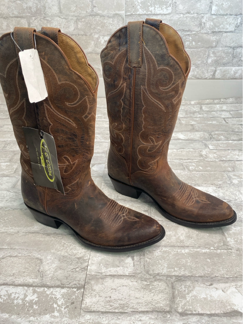 NEW Cowboy boots. Leather in a rich brown color, these boots feature almond toe shape and mid-calf shaft. Minor wear on sole from being tried on.