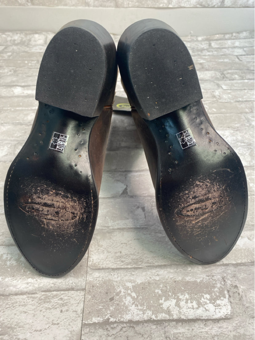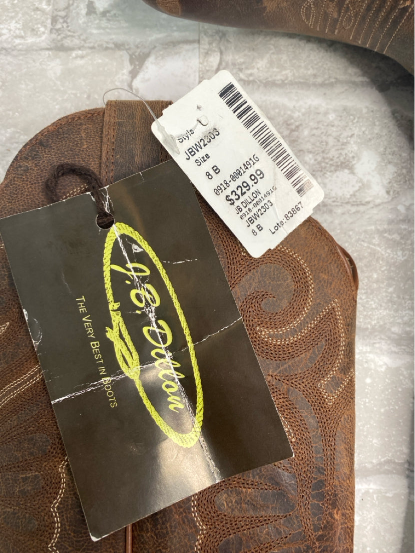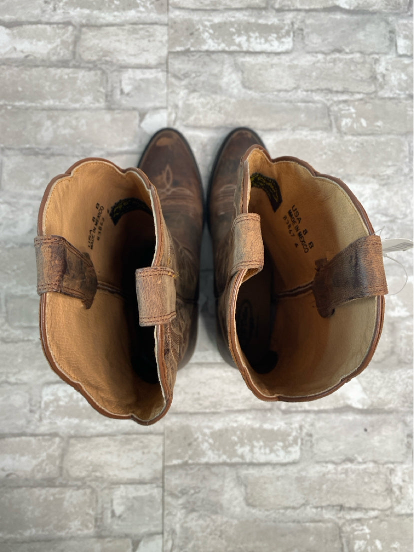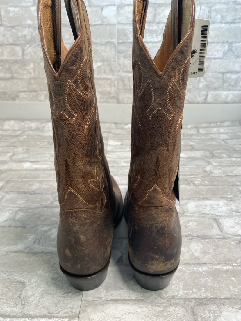 NEW Cowboy boots. Leather in a rich brown color, these boots feature almond toe shape and mid-calf shaft. Minor wear on sole from being tried on.