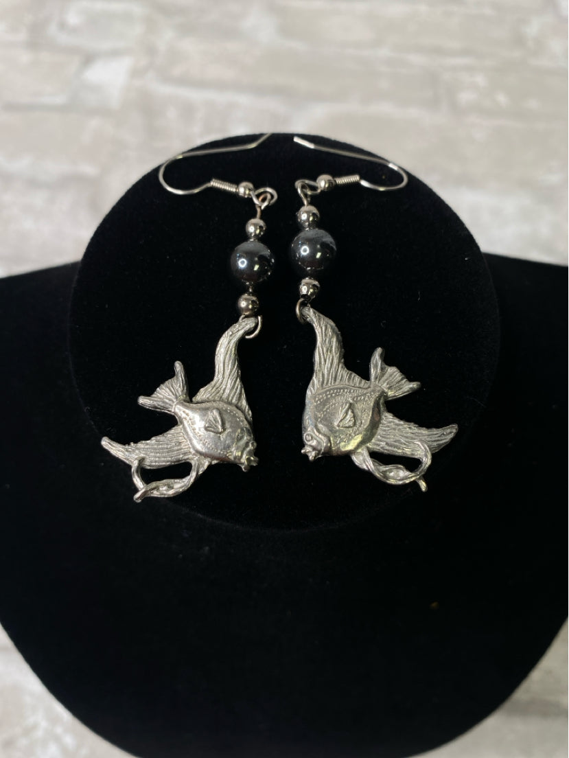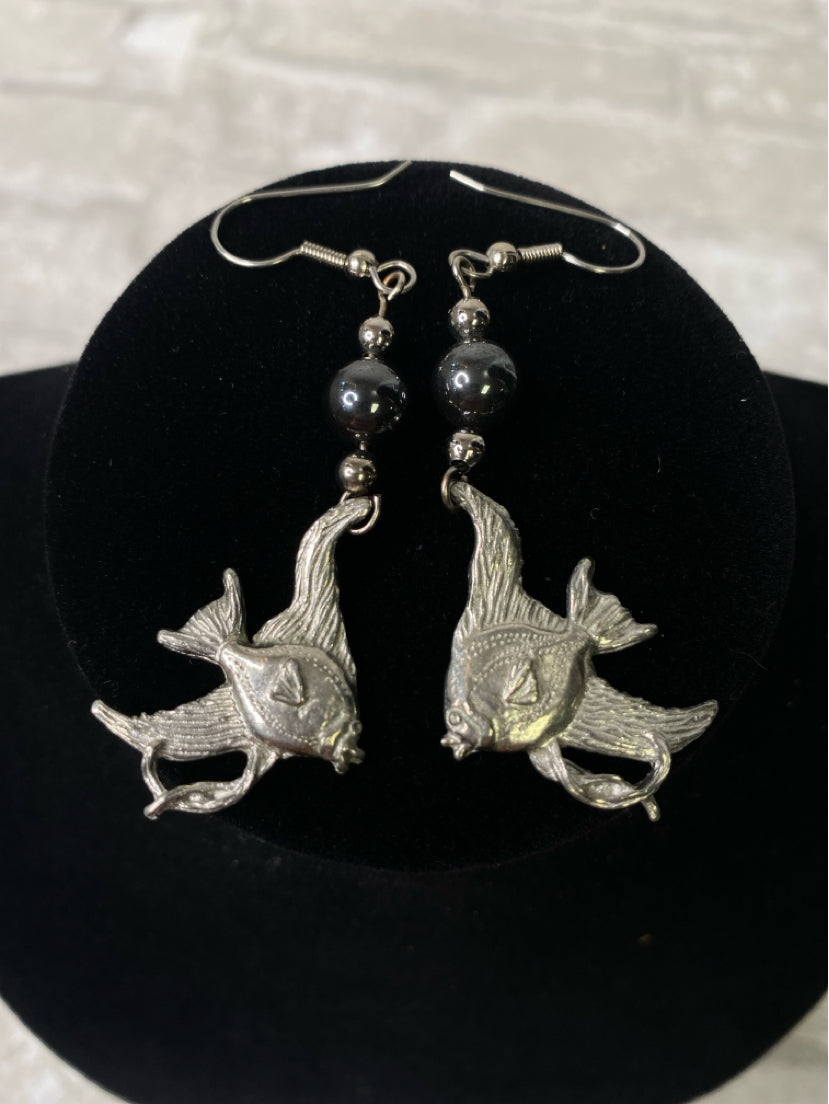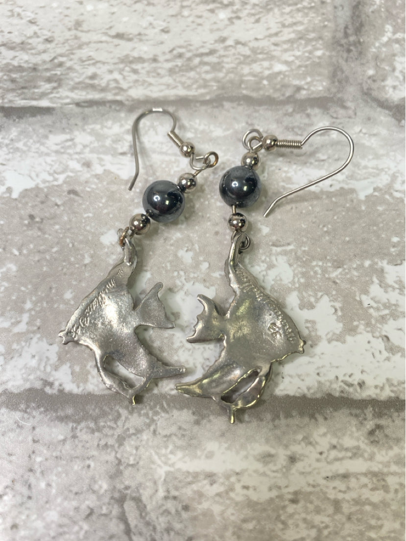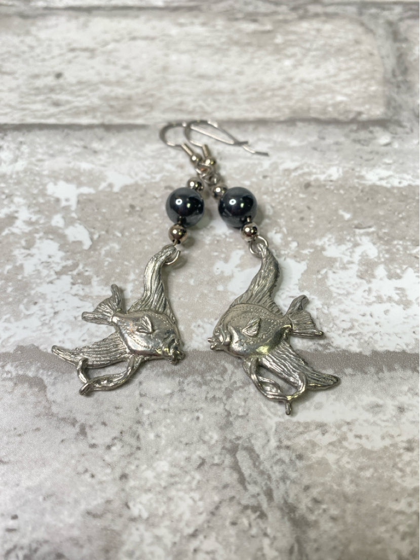 Beautiful high polished Pewter fish dangle earrings with magnetic Hematite bead accent.