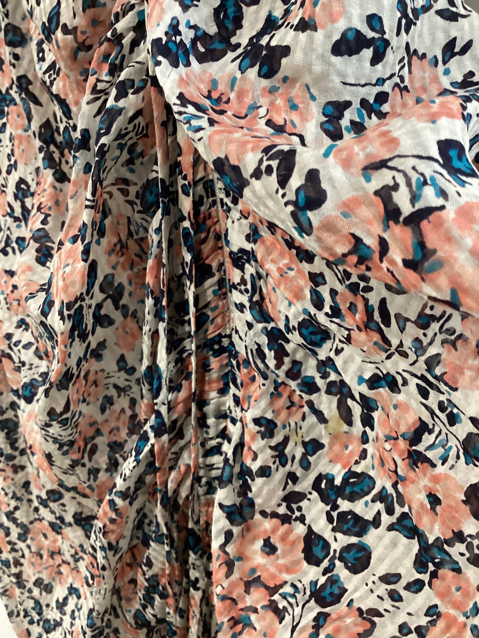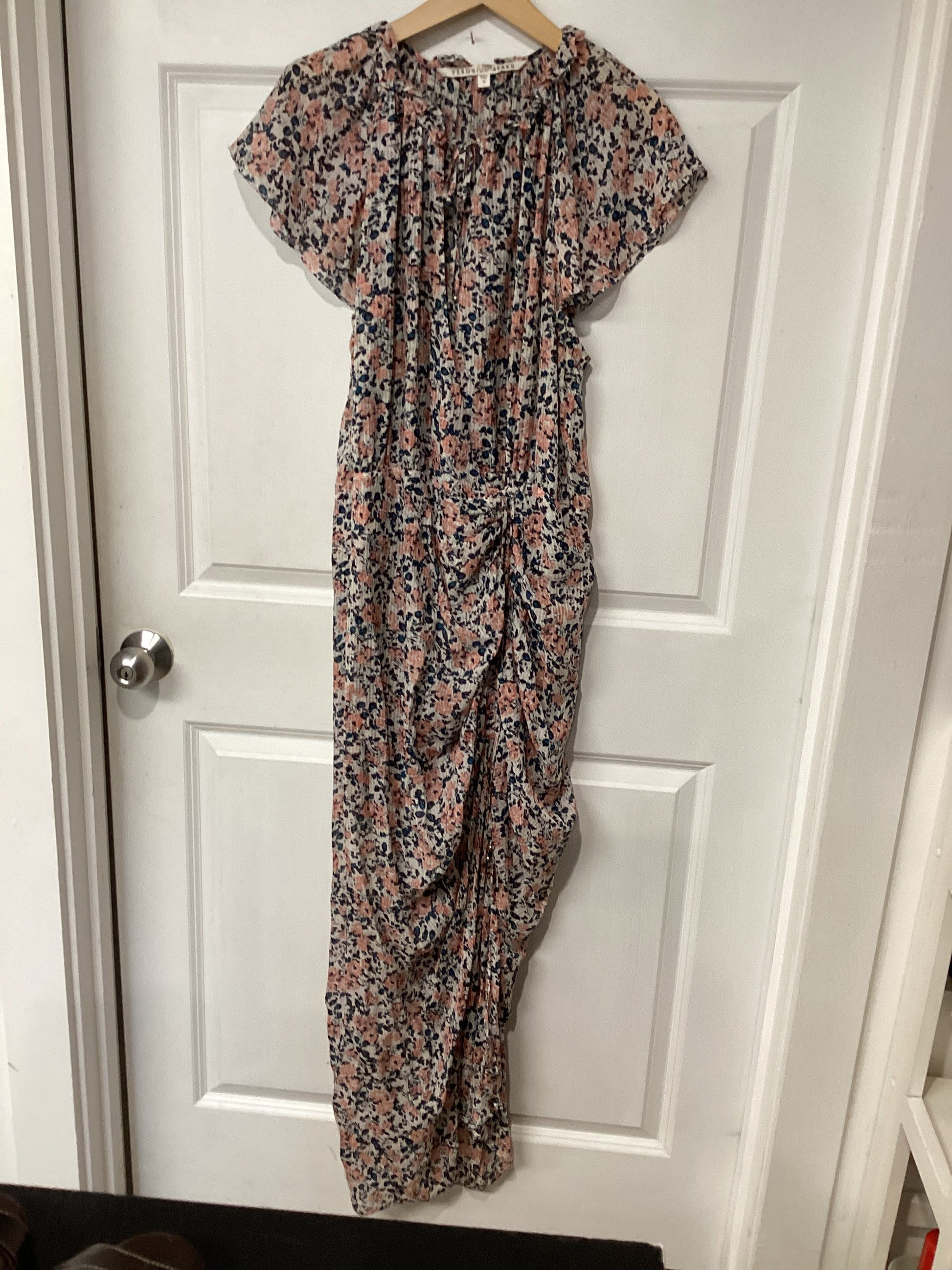 Veronica Beard Brynlee Ruched Silk Slit Floral Midi Dress. The silk silhouette features artful draping and a flirty front slit. Approx Flat MSMTS pit-pit 22" hips 19.5" shoulder to hem 57"
